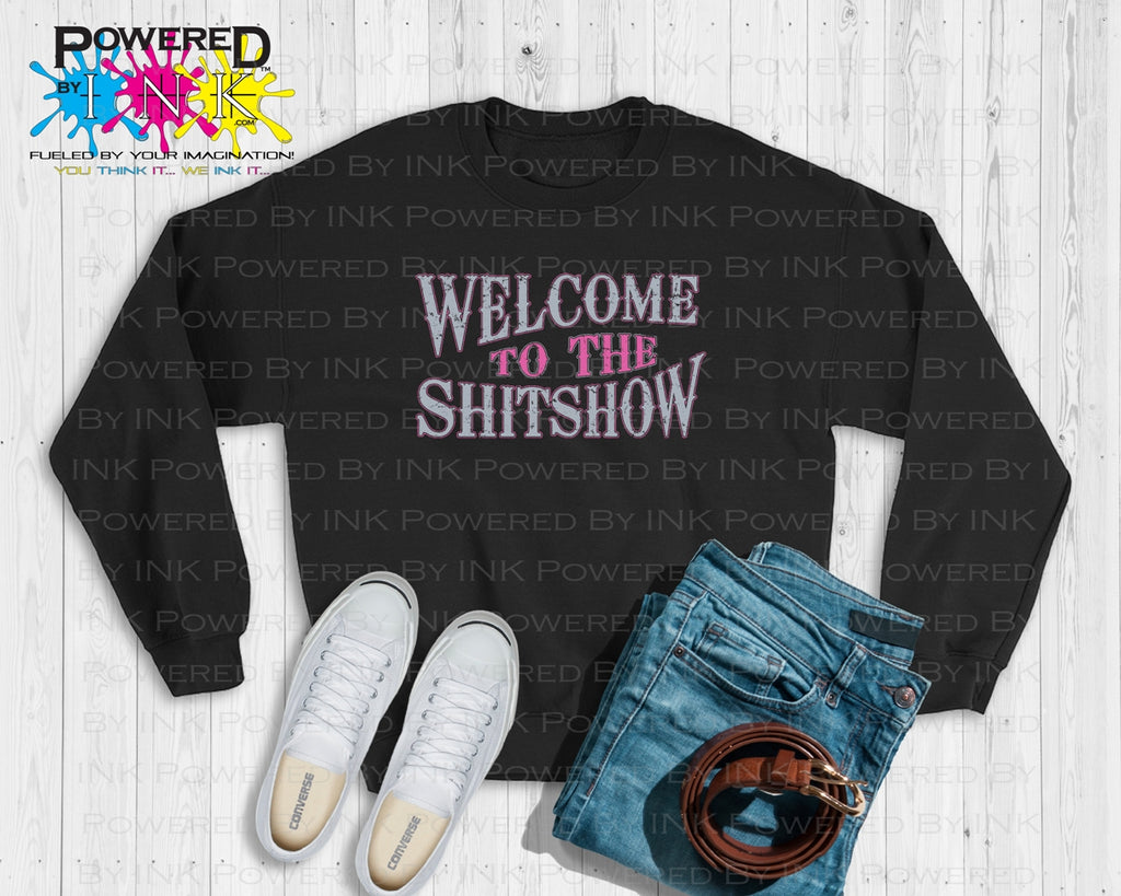 Welcome to the Shit Show Black Crew Sweatshirt with 3 design color options.